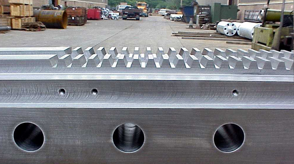 Custom Gear Rack Home » General Machining » Custom Gear Rack Product Summary The above picture shows an Thrust Bar Gear Rack. Click on above pictures for better quality. Specifications Materials: The material is 4140 plate that was flame cut and hardened to 280 Brinell. Size: 3 3/4" x 7 " x 59" long Gear Teeth: 30 teeth-4/5 DP. and flame hardened.
