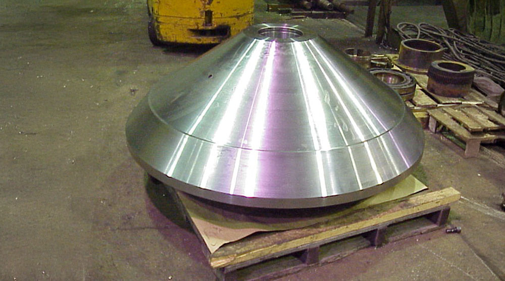 Tapered Cone Home » General Machining » Tapered Cone Product Summary Tapered Cone. This cone has the OD and ID turned. This one shown is 59" in diameter and 26" high. Finished weight is just under 6000 pounds. Click on above pictures for better quality. Specifications Materials: ASTM A148 Size: Varies, from 40-59" OD x up to 26" high